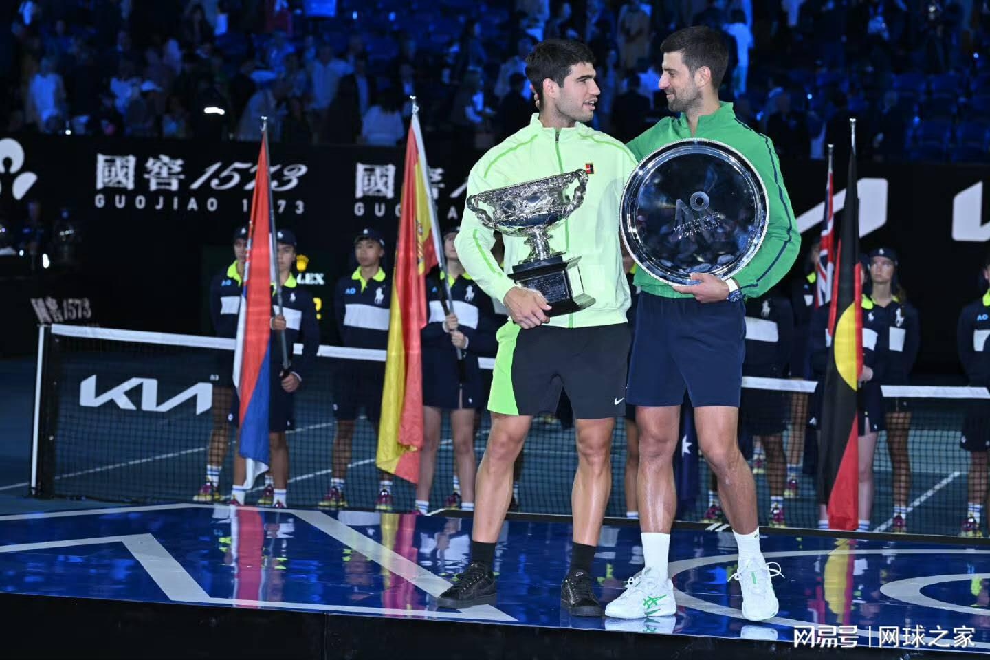 最终的决赛,赛事方邀请到纳达尔重返澳网收官。一边是自己的一生之敌德约,一边是西班牙的小老弟,最终在纳达尔的亲眼目睹下,阿卡以打破纳达尔最年轻集齐男单四大满贯的纪录,书写了新的历史。